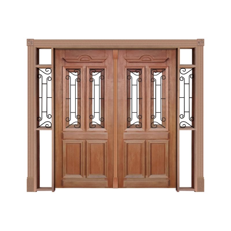 Itens: Portal Duplo para vidro, 02 folhas de Porta Duquesa com Grade, Guarnições Unha de Gato para os dois lados, 02 pares de rosetas torneadas.